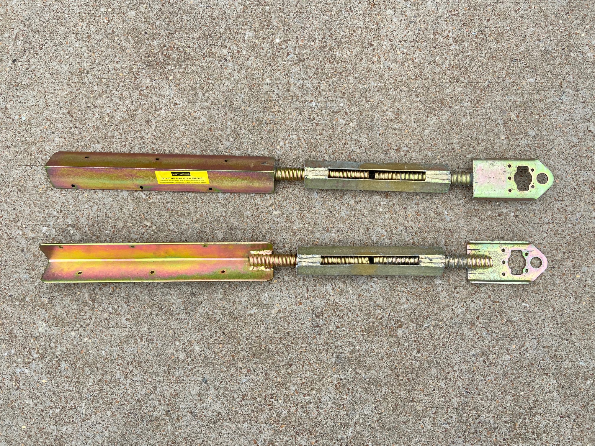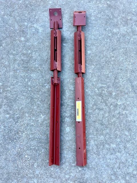 Universal Formworks USA's Steel-ply Straight & Bent Turnbuckles (turnbrackets) for Steel-Ply Forms are designed to align vertical formwork. The turnbuckles allow for 6 inches of adjustment and is fully zinc plated. The Turnbuckle - Bent Plate standard consists of a length of angle iron, a self-cleaning turnbuckle and a steel toe plate. The angle iron is equipped with nail holes allowing the turnbuckle to be attached to a 2x4 or 2x6 to extend the reach. The Turnbuckle is fabricated with coil threads for quick and easy adjustments and the steel toe plate can accept a round steel stake, or to be nailed to a wood stake, or be inverted and nailed directly to a stud or wales. The Turnbuckle - Straight Plate is equipped with a spade-type toe plate designed for use with modular forms and wedge bolts. The safe working load for the Form Aligner is determined by the method of attachment and the extension lumber used.