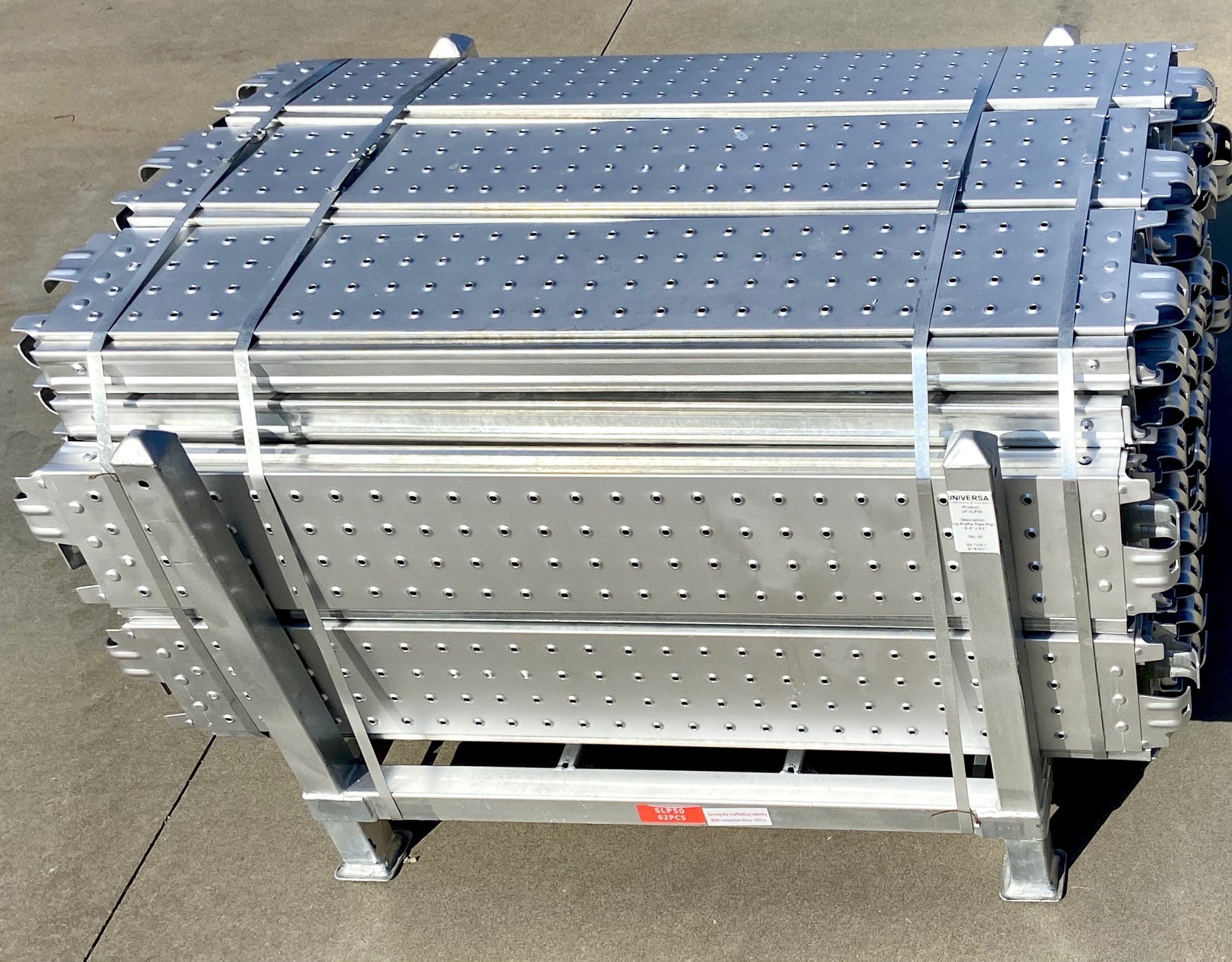Universal's Low-Profile "Dog-Ear" Steel Scaffold Planks are 9.5" wide and lay flush with the horizontal to prevent trip hazards. The galvanized planks come complete with a non-slip surface for improved grip and have attached to them a wind latch to prevent any lift from detaching the plank from the horizontal. Universal keeps a very large stock on all sizes of these planks ranging from 2'0" to 10'0".