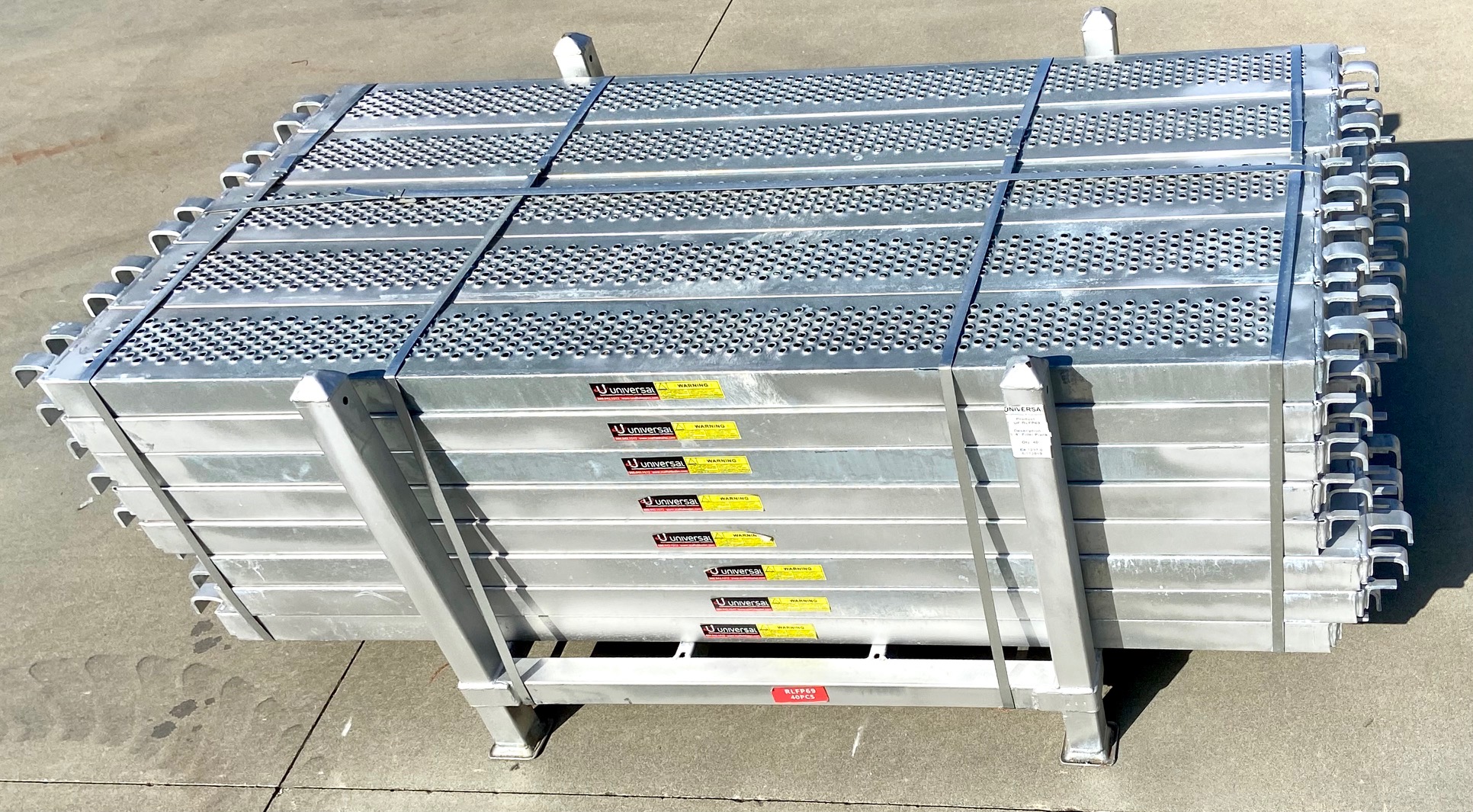 Universal's Metal Filler Scaffold Plank 7.5" Wide works with the 12.5" Wide Layher-style Metal Planks with hooks. These come with a perforated surface for increased grip and wind latches to secure the planks to the horizontals and prevent any detaching from upward wind or forces. These planks come fully hot-dip galvanized with a non-slip surface and work primarily with ringlock or cuplock scaffolding.