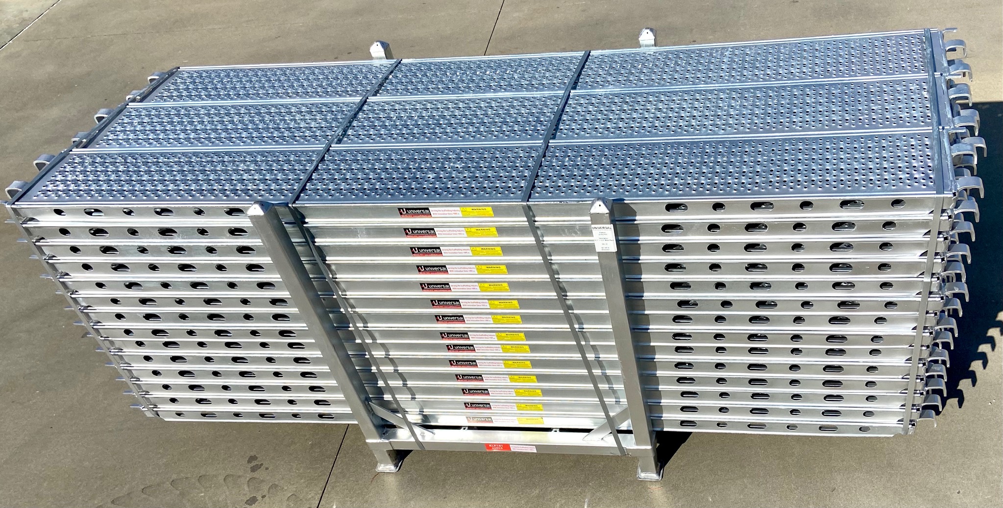 Universal's 12.5" Wide Layher-style Metal Scaffold Planks with hooks have a perforated surface for increased grip and come complete with wind latches to secure the planks to the horizontals and prevent any detaching from upward wind or forces. These planks come fully hot-dip galvanized with a non-slip surface and work primarily with ringlock or cuplock scaffolding.