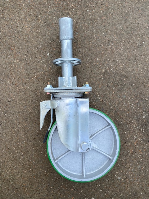 The heavy-duty 12" caster wheel comes with a variety of attachments including the 1.5" diameter screwjack adapter which is reinforced at the base with four heavy-duty gussets. The wing nut is adjustable to 20". For Unilock Ringlock system scaffold the caster wheel comes with a base collar attachment with reinforced heavy-duty gussets. Finally, for Universal Cuplock scaffolding the caster wheel has a Cuplock Caster Adapter.